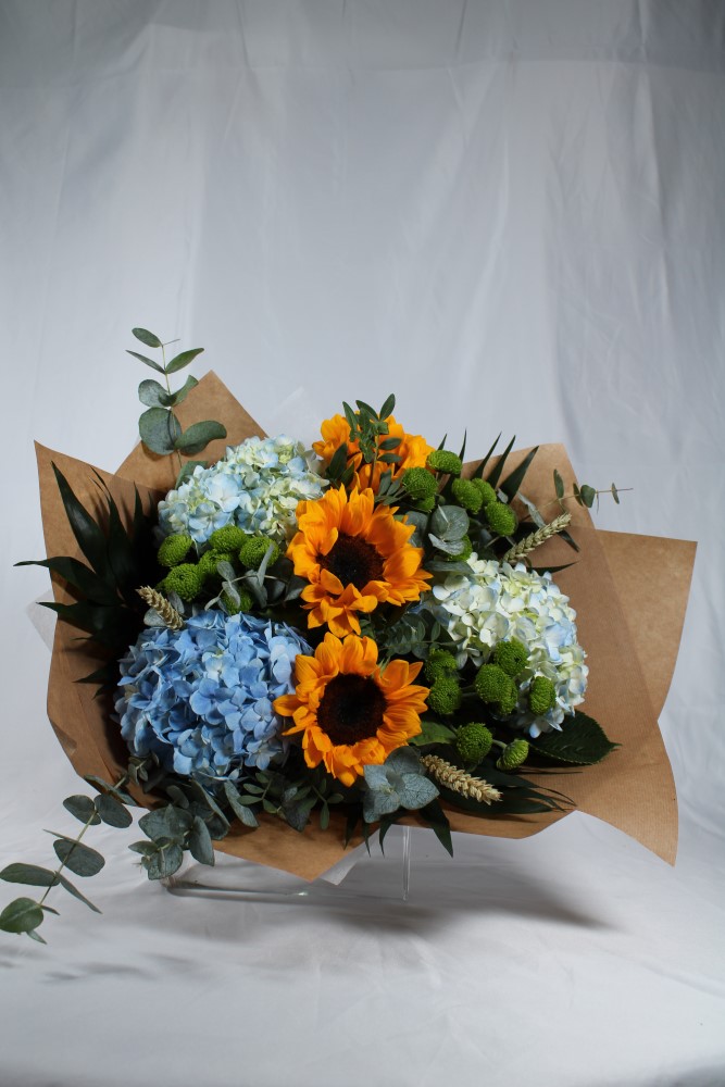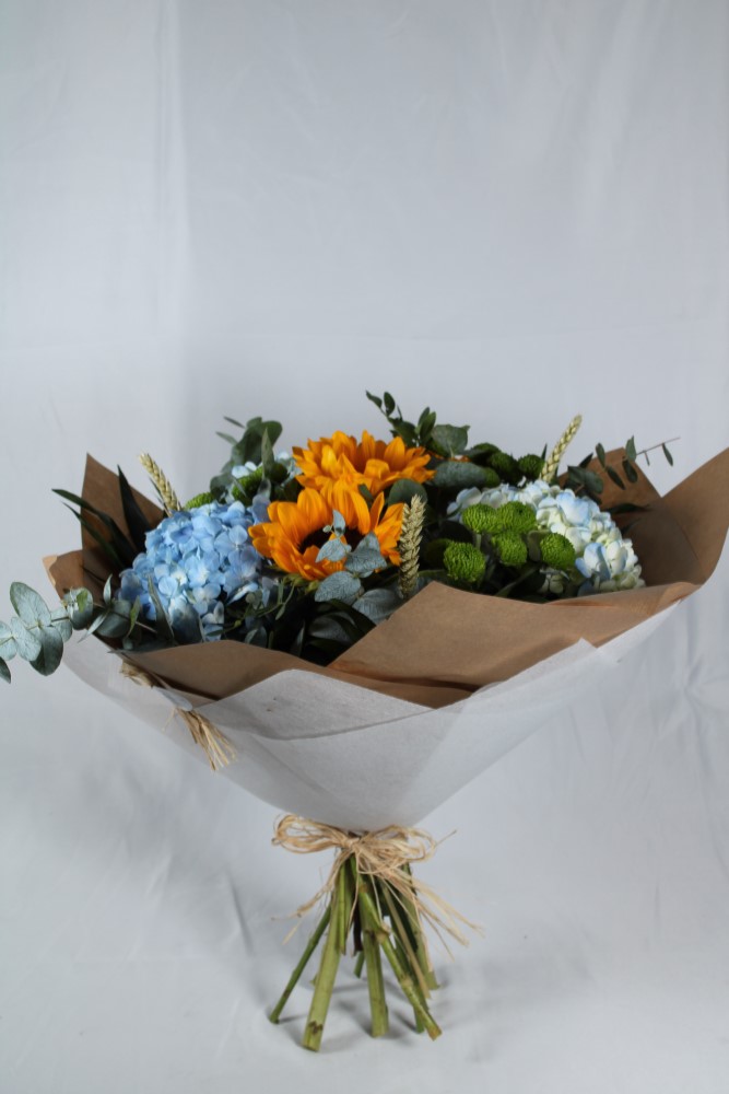 Este precioso ramo incluye una selección de flores frescas como margaritas, hortensias, girasoles, trigo, … además de verdes exóticos que recibimos diariamente. Dependiendo de la temporada, las flores pueden ser de origen nacional o importadas de Holanda, siempre asegurando la máxima calidad.