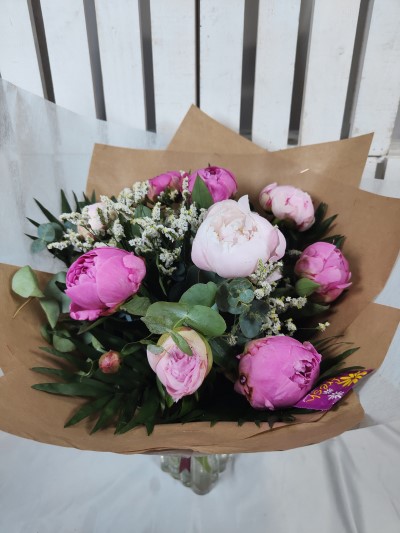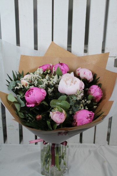 Romántico, elegante y lleno de encanto, este bouquet está compuesto por exquisitas peonías en tonos rosa intenso y rosa pálido, acompañadas de delicadas flores blancas de relleno y follaje fresco. Envueltas en papel kraft y tul blanco, y presentado en un florero de vidrio decorado con lazo satinado, es la opción perfecta para celebrar momentos especiales: aniversarios, cumpleaños o simplemente para decir «te quiero».
