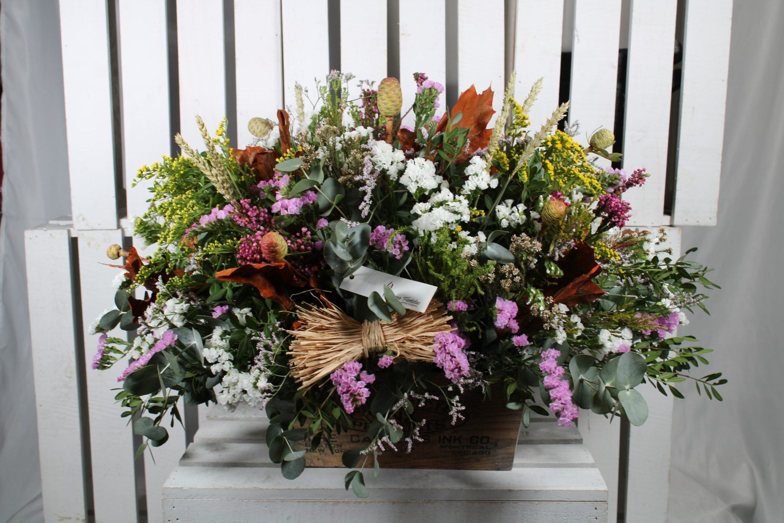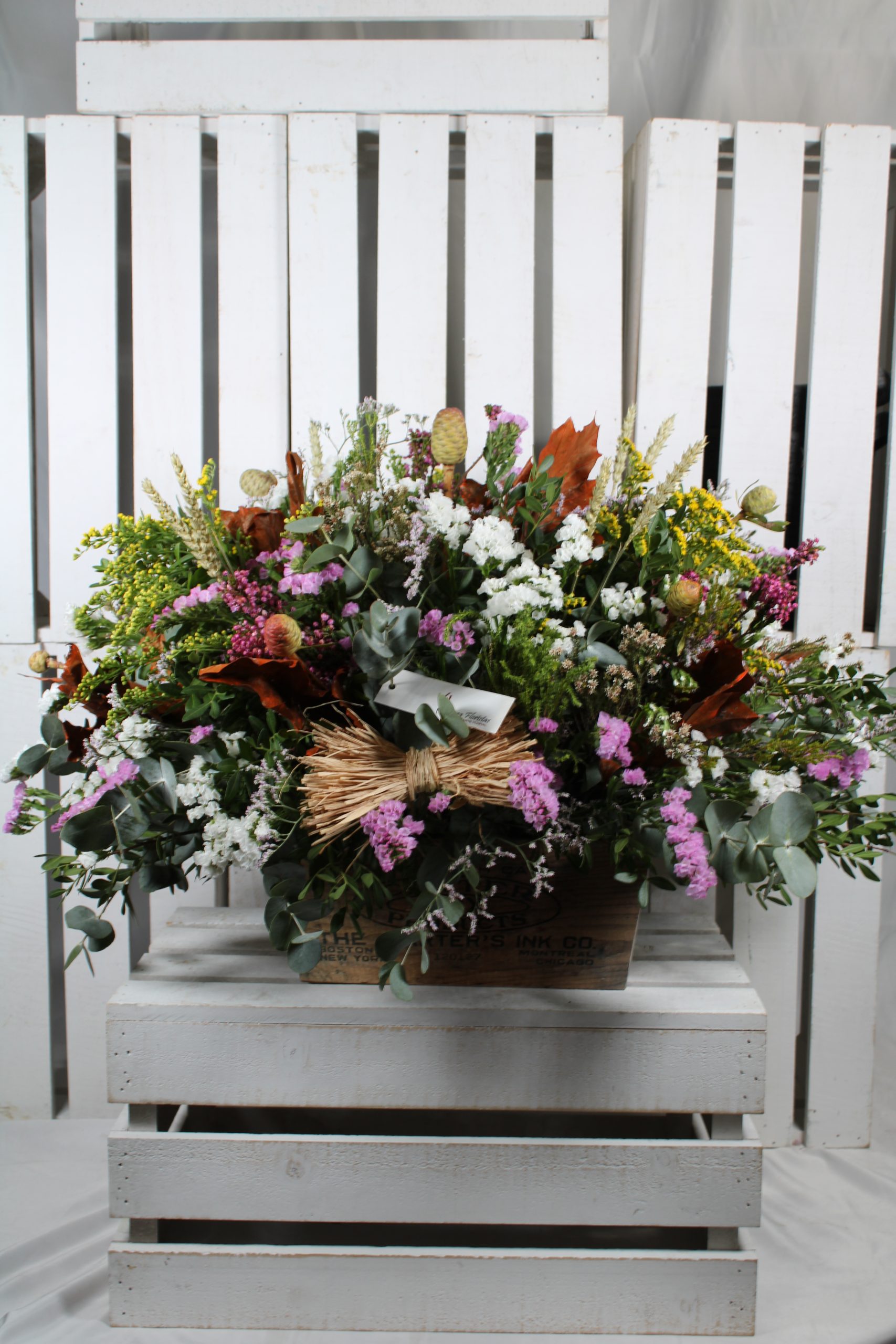 Descubre nuestra encantadora Caja de Flores silvestres una composición donde la frescura, el color y la armonía se unen para transmitir alegría y cariño en cualquier ocasión. Diseñada con esmero por nuestros floristas, esta cesta combina flores silvestres que perduran en el tiempo y una selección de verdes exóticos que aportan volumen y elegancia natural.