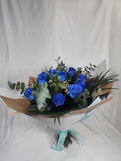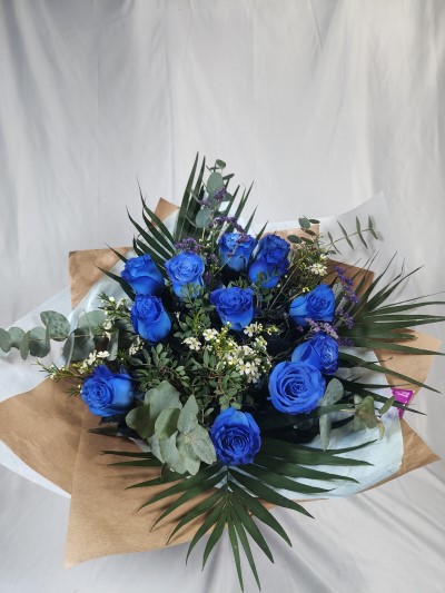 Impresionante y original ramo de Rosas Azules de tallo largo. Te las decoramos con el toque único de Ainara Floristas. Estas rosas de primera calidad destacan por su misterio y singularidad natural.